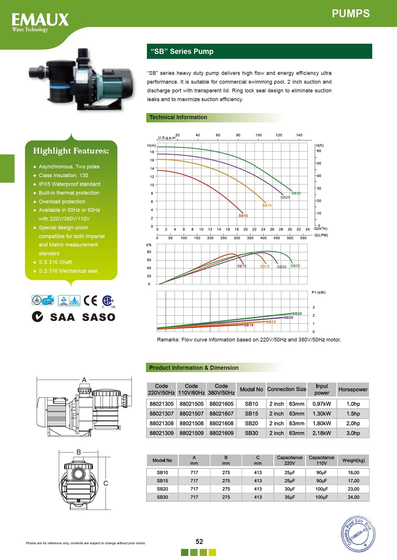 Emaux SB Series Extreme Centrifugal Pump is engineered to deliver ultra performance to both high and medium head installations in large-sized swimming pool and commercial spas. This high flow pump is designed to exceed builder, serviceprofessional and customer requirements.